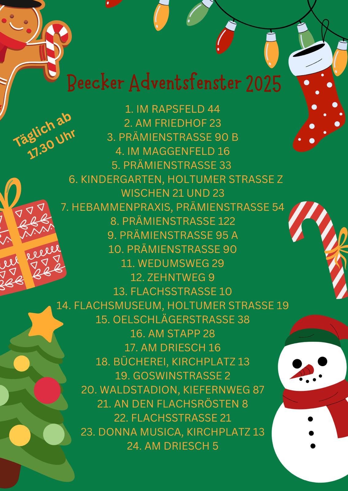 Auch in diesem Jahr wird das beliebte Beecker Adventsfenster wieder durchgeführt. Engagierte Beeckerinnen und Beecker gestalten in der Adventszeit ihre Fenster mit viel Herzblut und Kreativität.