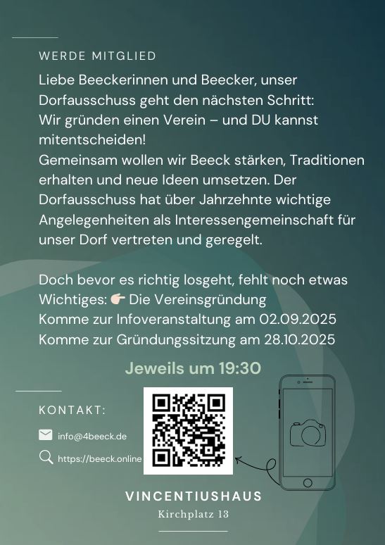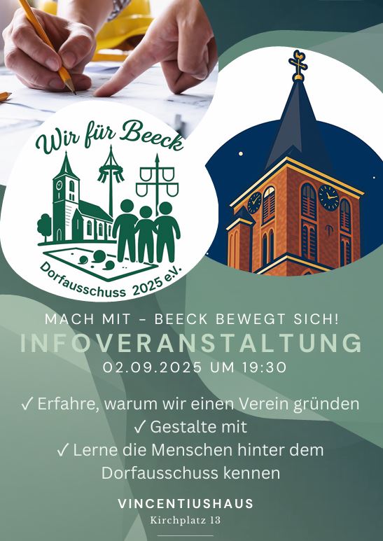 Wir sehen uns am 28.10.2025 um 19:30 Uhr im Vincentiushaus. Dort wird der Dorfausschuss Beeck e.V. formell ins Leben gerufen. Wir freuen uns.