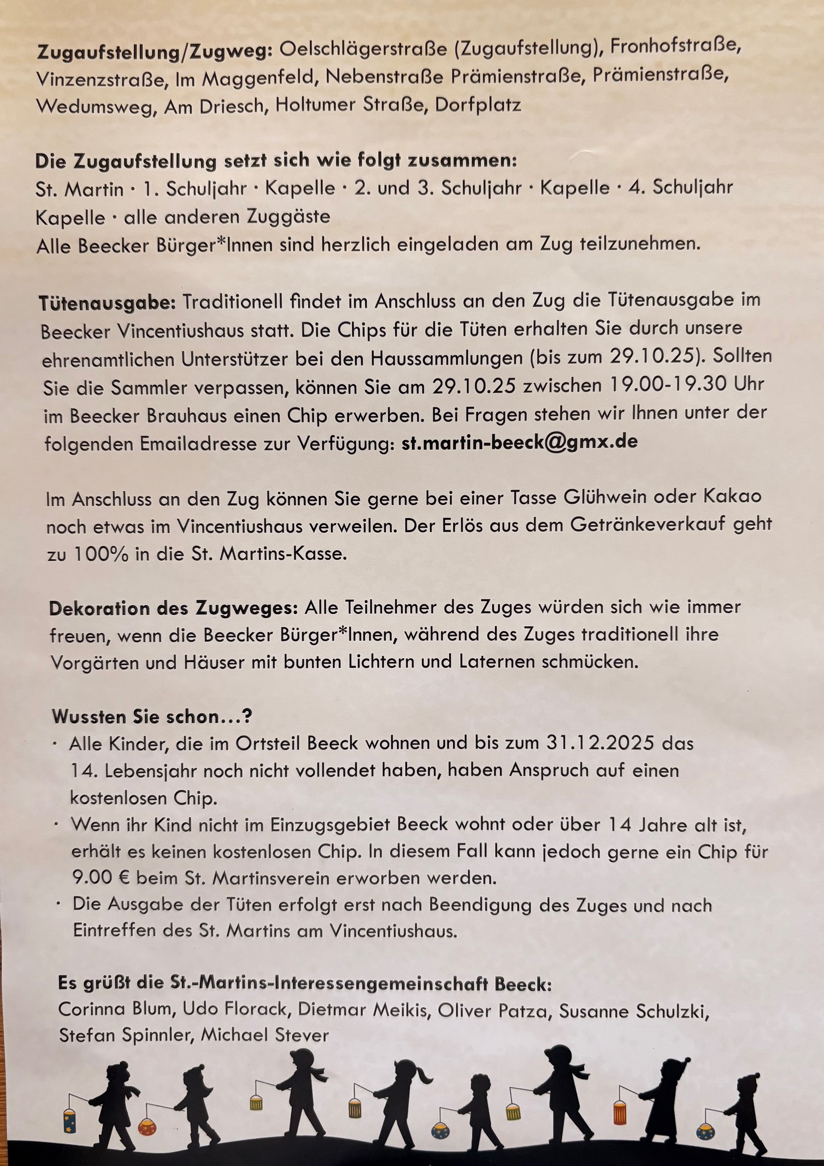 Wir suchen dringend Sammler. Der Aufwand für das Sammeln und die Abrechnung der Haussammlung liegt je Sammler lediglich bei ca. 2-3 Stunden pro Jahr. Da sich die St. Martins-IG Beeck ausschließlich aus Spenden finanziert, ist die Haussammlung Grundvoraussetzung für die Beibehaltung des Umzugs, der Tütenausgabe und des insgesamt mit dem Martinsfest verbundenen Brauchtums.
